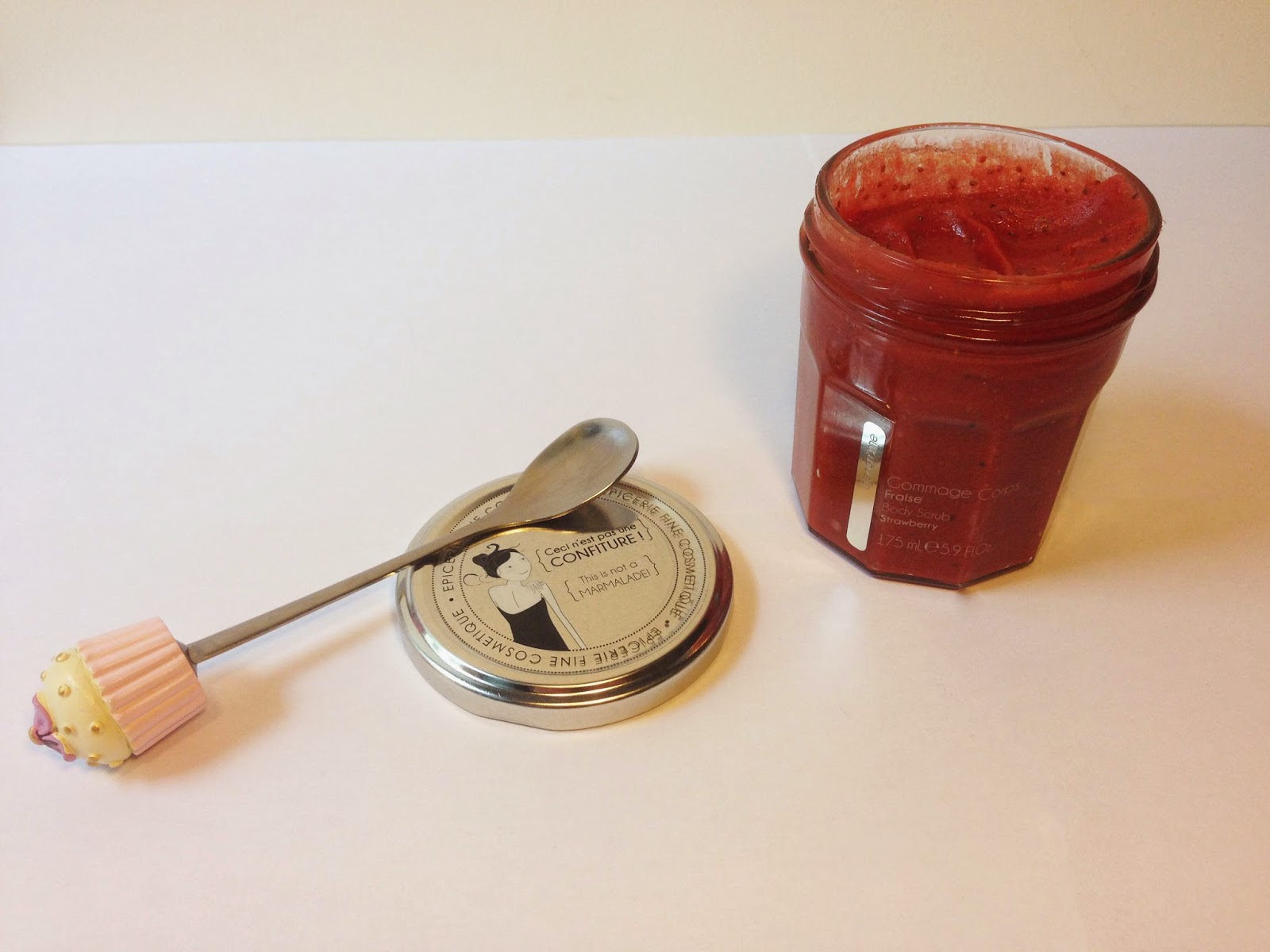 Ensuite, je ne pouvais pas passer à côté de la gamme à la fraise. J’ai donc opté pour le Gommage corps à la fraise qui ressemble autant par le packaging que par la texture à une confiture. Et dès l’ouverture, qu’est ce que sa sent bon ! Il a la texture d’une ”pâte” avec des grains de sel de mer. Le gommage peut s’utiliser sur peau sèche ou sur peau humide exfolie délicatement la peau. Seul petit bémol, le pot est en verre donc facilement cassable.